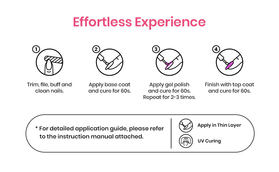 - Speed Curing with LED Nail Lamp: The gel nail polish kit needs to be cured under LED light. Base and Top coat required. Average curing time for LED light is 60-120 secs.