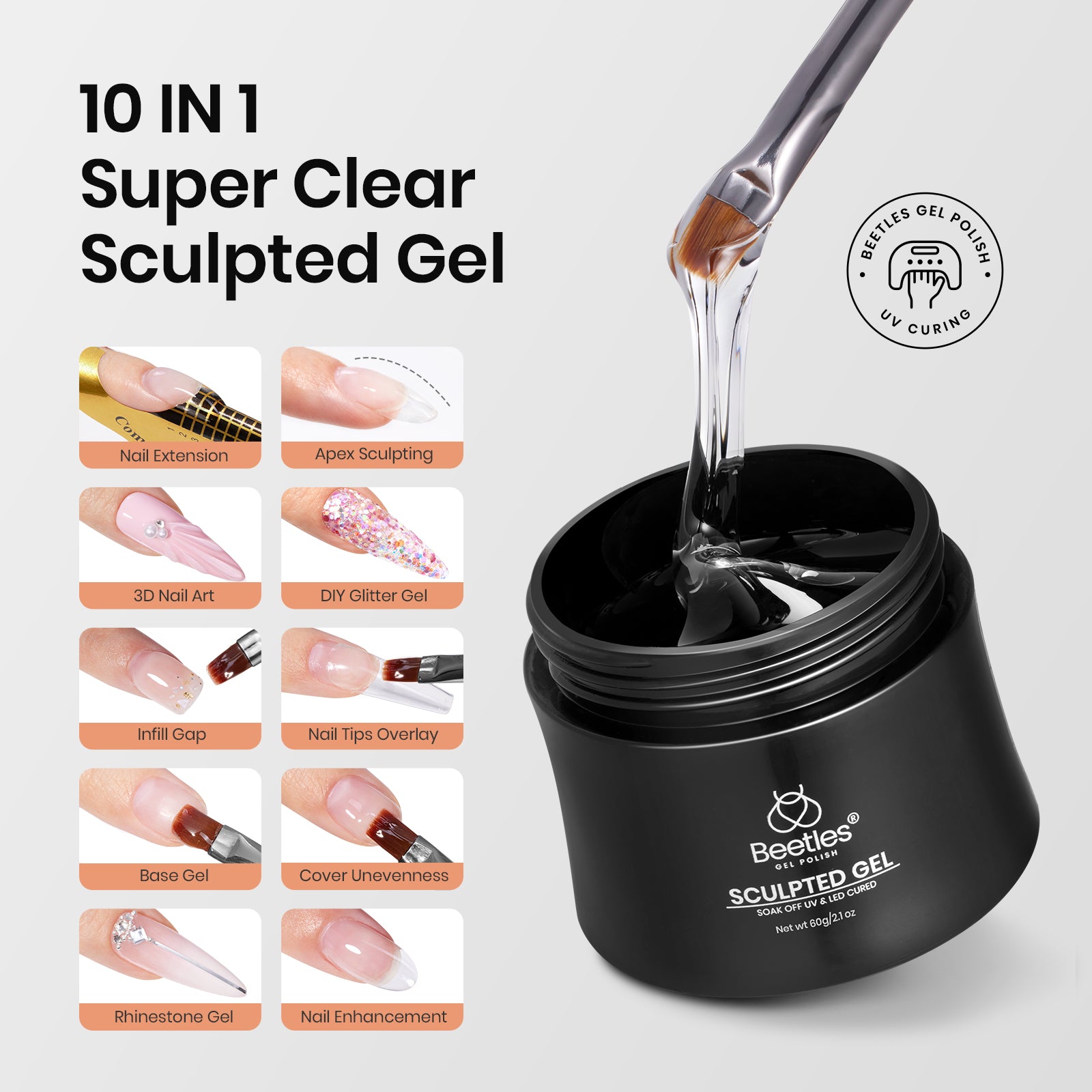 - 【10-in-1 Beetles Sculpted Gel Set】Beetles builder nail gel in pot can give you amazing results during your DIY manicure. Used for nail extensions to any length; as building gel for fuller nails; as BASE COAT or STRENGTHJEN GEL to increase the hardness of nails, making nails less likely to break; mixed with glitter powder to a Hybrid Gel, etc..