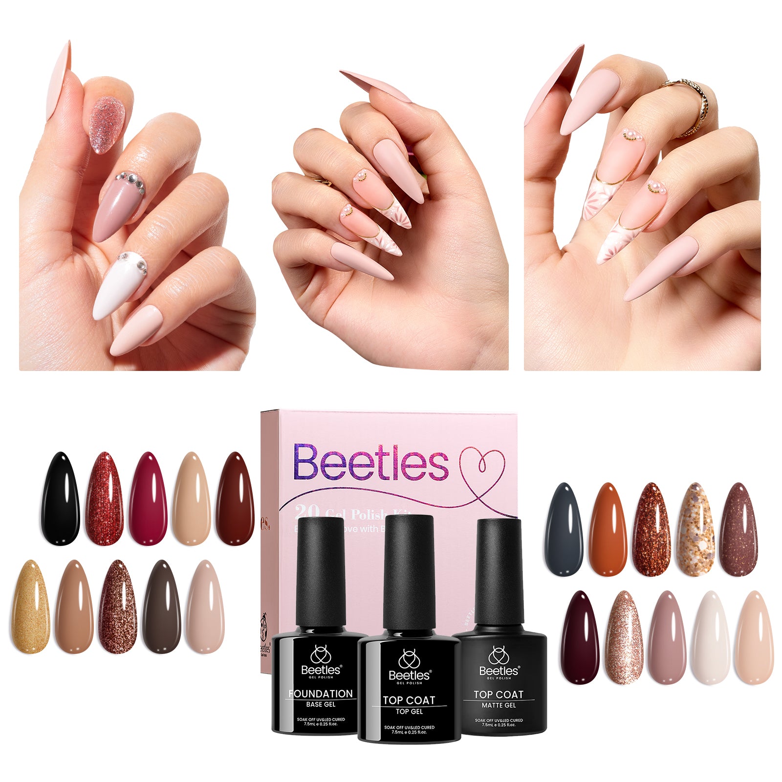 Beetles 20 Colors Luxurious Autumn Series Black Gel Nail Polish Set, 23Pcs Autumn Brown Red Yellow Gold Sequins Gel Sparkling Glitter Gel Nail Polish Kit with Glossy & Matte Top Coat Base Coat