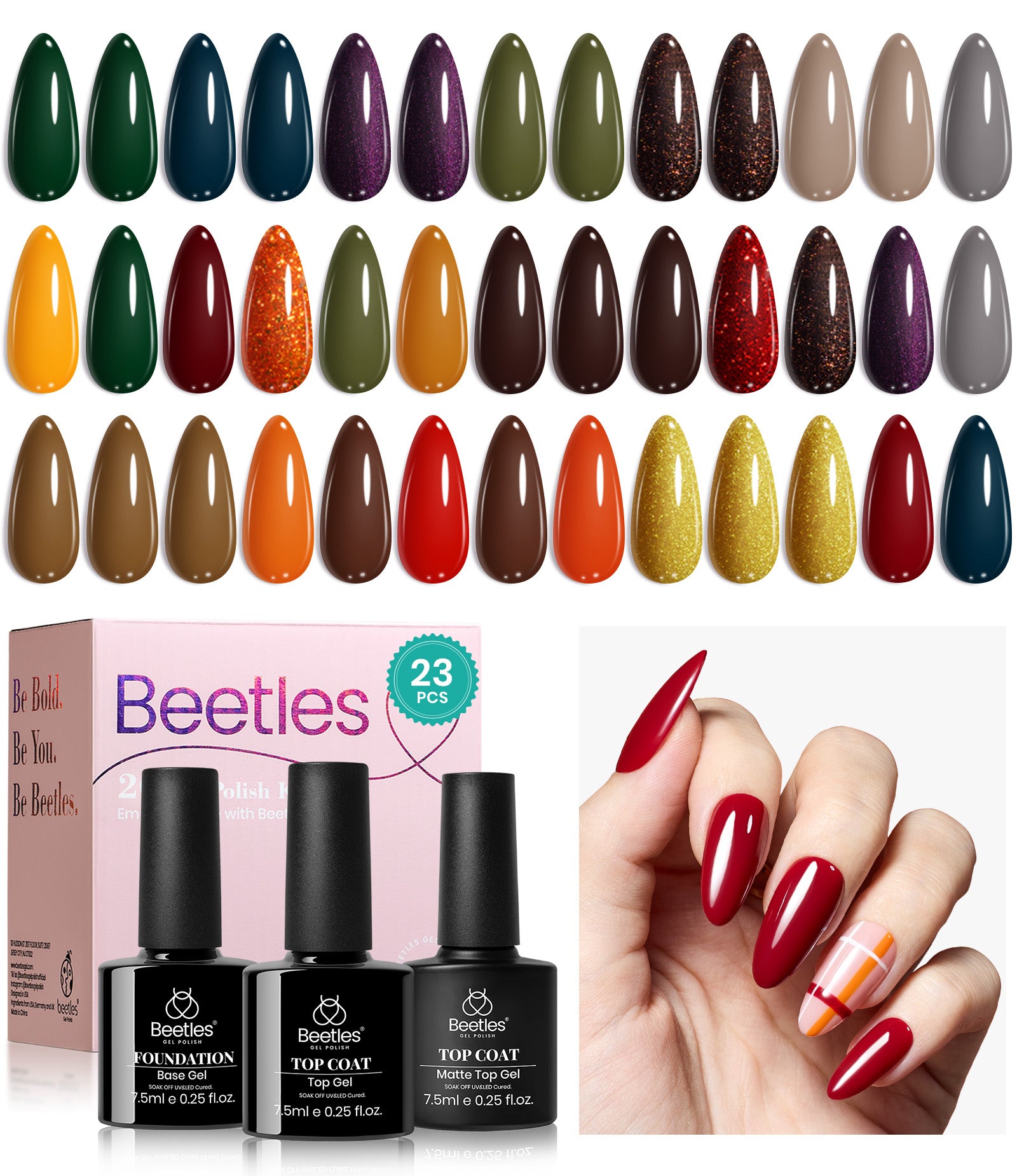 Beetles 23 pcs Gel Polish Nail Kit, 20 Colors Glitter Brown Gold Purple Grey Fall Forest Collection Gel Polish Set Soak Off Uv Lamp Need Base Glossy & Matte Top Coat Orange Blue Yellow Green Manicure Kit Gift for Girls