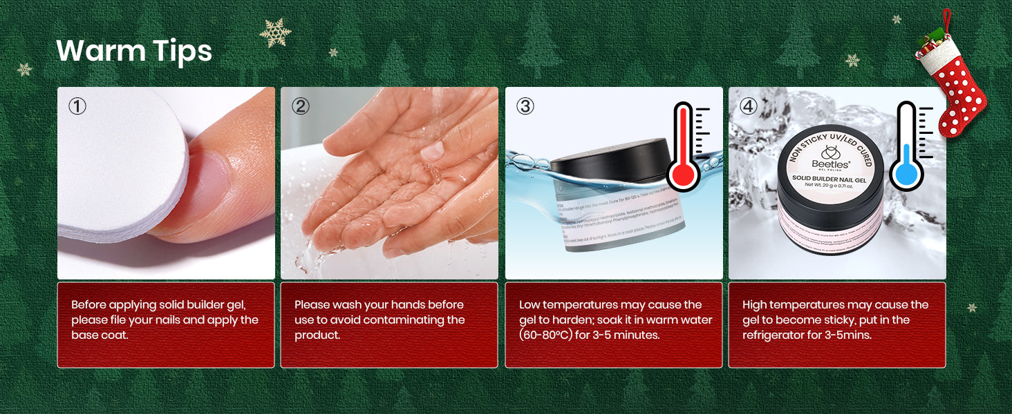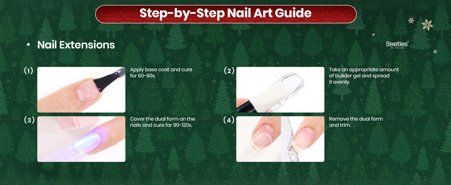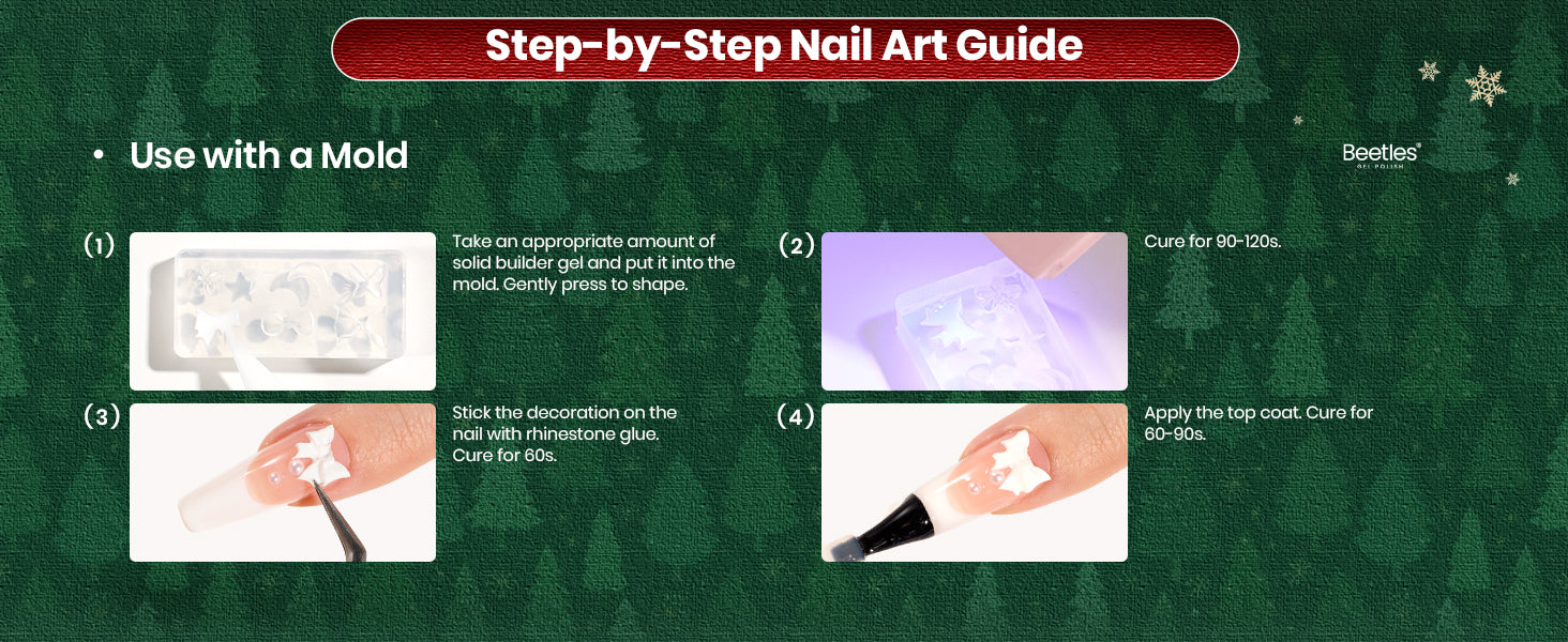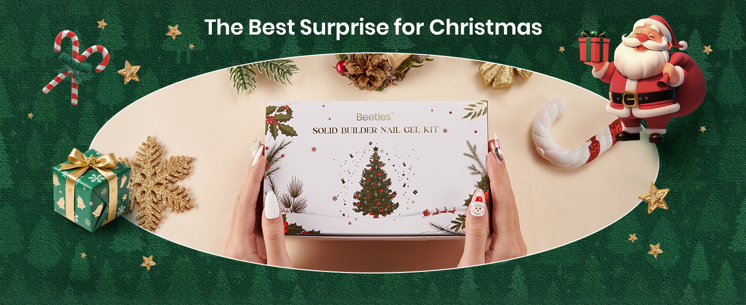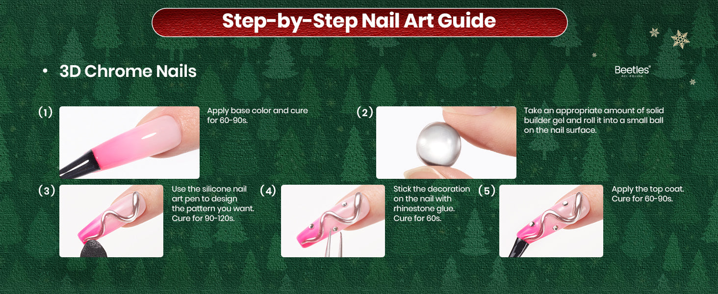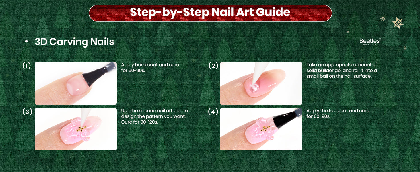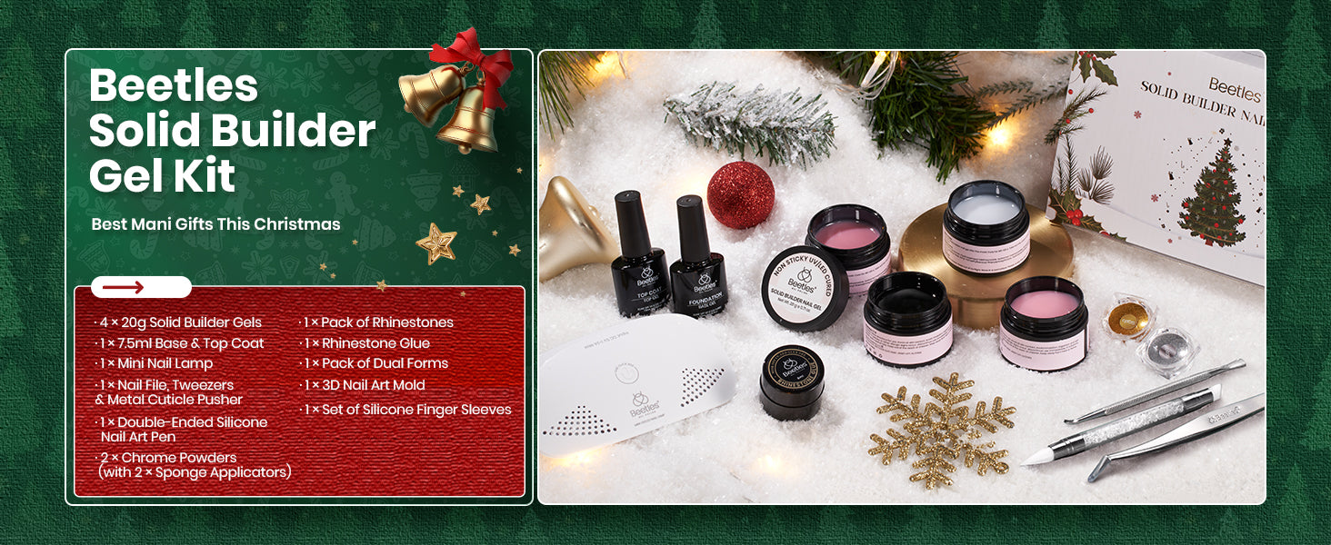 - Beetles 3D Gel Nail Art Kit-Christmas Limited:4*20g(Clear,Pink,Light Pink, White),Base Coat & Top Coat,Nail Lamp,1* Nail File, Tweezers& Metal Cuticle Pusher,1*Double-Ended Silicone Nail Art Pen,2*Chrome Powders,1* Rhinestones,1* Rhinestones Glue,1*Pack of Dual Forms,3D Nail Mold,1*Set of Silicone Finger Sleeves