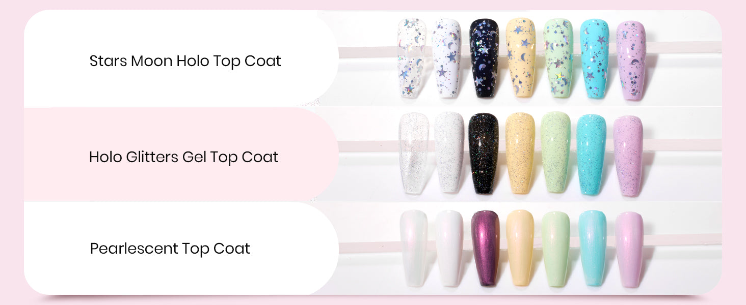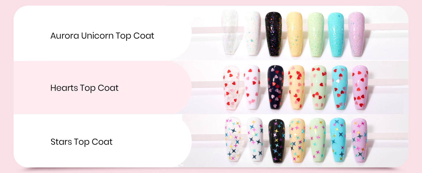 - 【What You Get】: 6Pcs 10ml Gel Top Coat Set, which includes Heart top coat *1, Pearlescent top coat*1, Star Top Coat*1, Star Moon Holo Top Coat*1, Holo Glitter Gel Top Coat*1, Aurora Unicorn Top Coat*1;