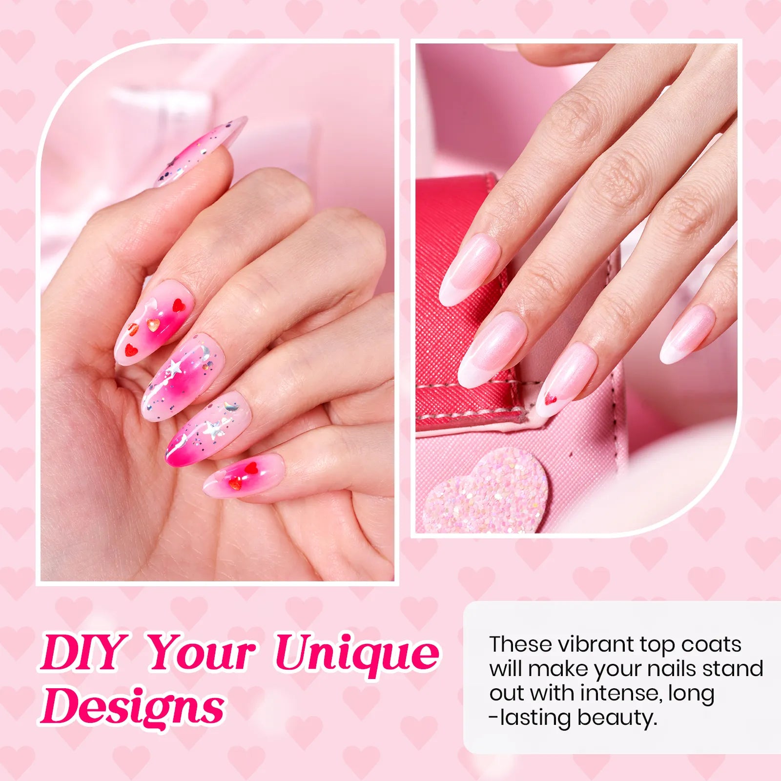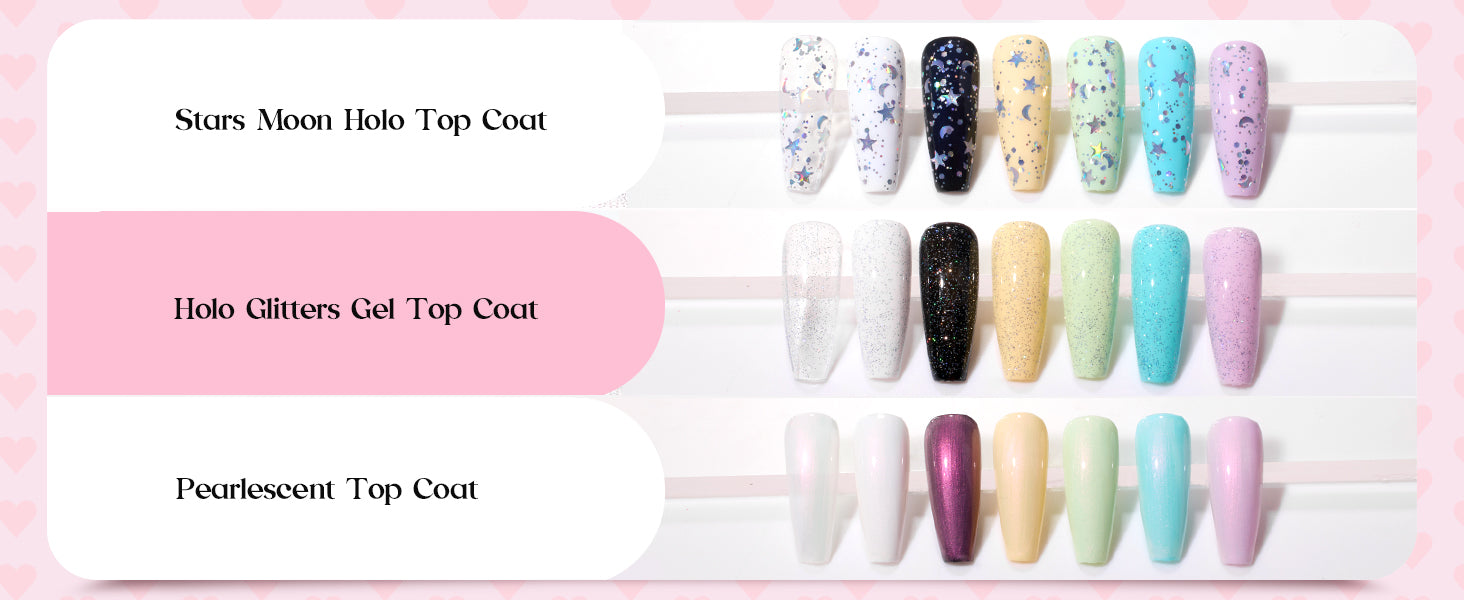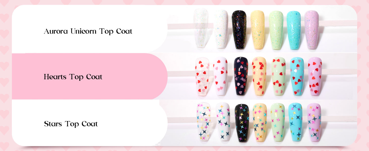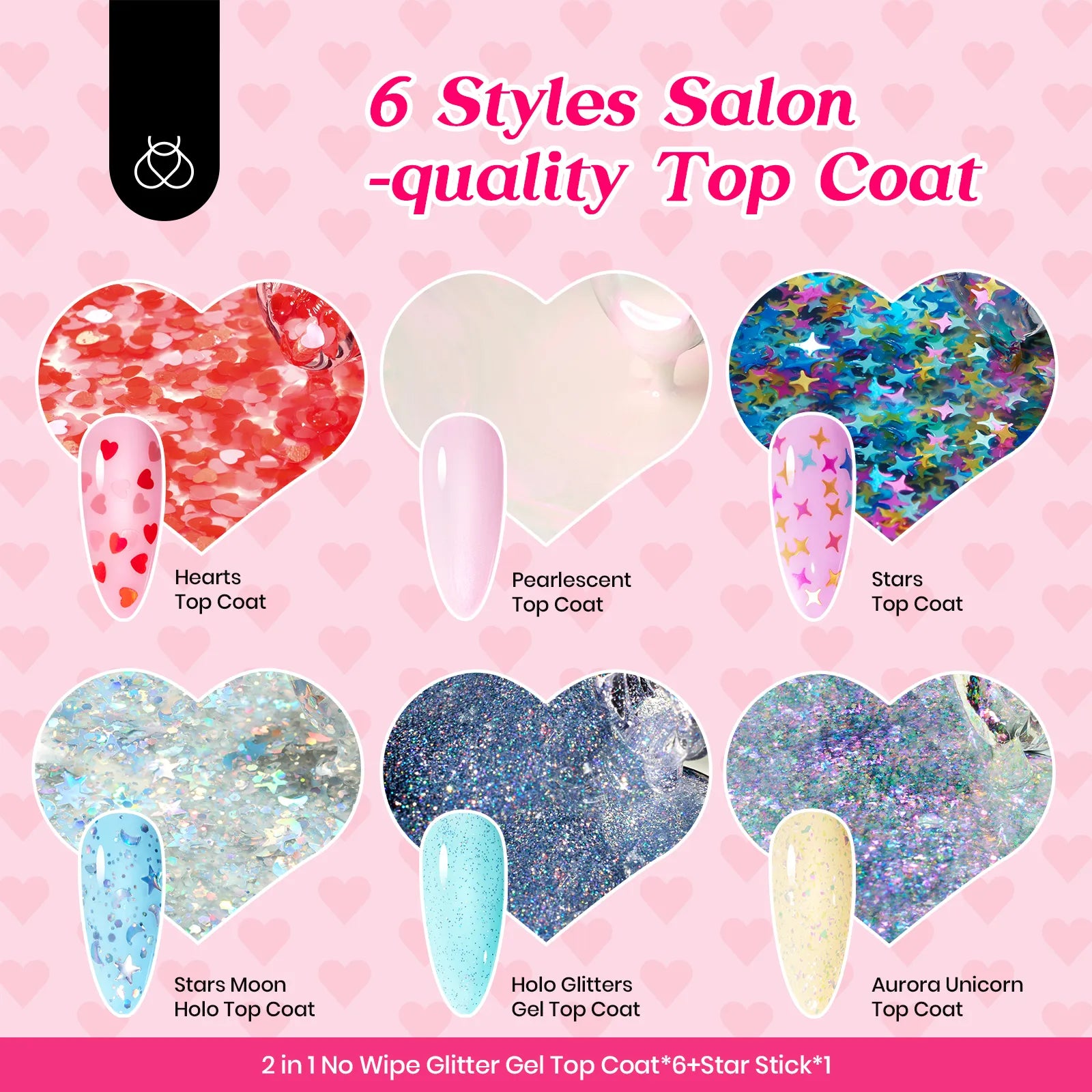 - What You Get: 6Pcs 10ml Gel Top Coat Set, which includes Heart top coat *1, Pearlescent top coat*1, Star Top Coat*1, Star Moon Holo Top Coat*1, Holo Glitter Gel Top Coat*1, Aurora Unicorn Top Coat*1;