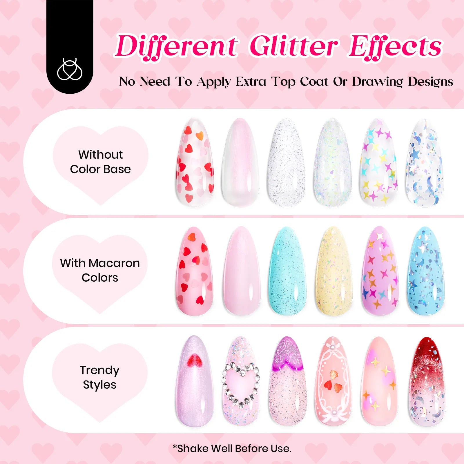 - 2025 PresentThe functions of glitter and sealer are combined to save you time, only needs to be applied once and makes your nails shine like the Northern Lights, accommodates all shades, pair with a variety of colors and add a touch of pizzazz.