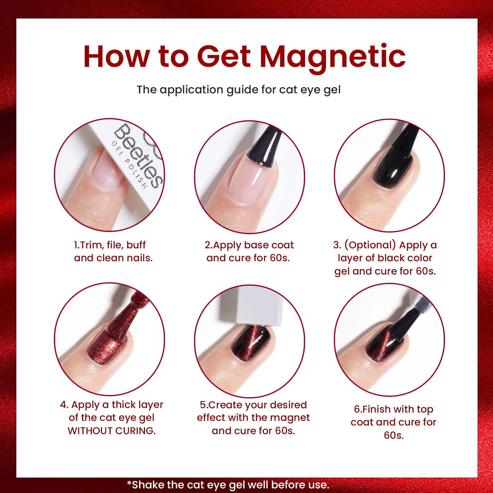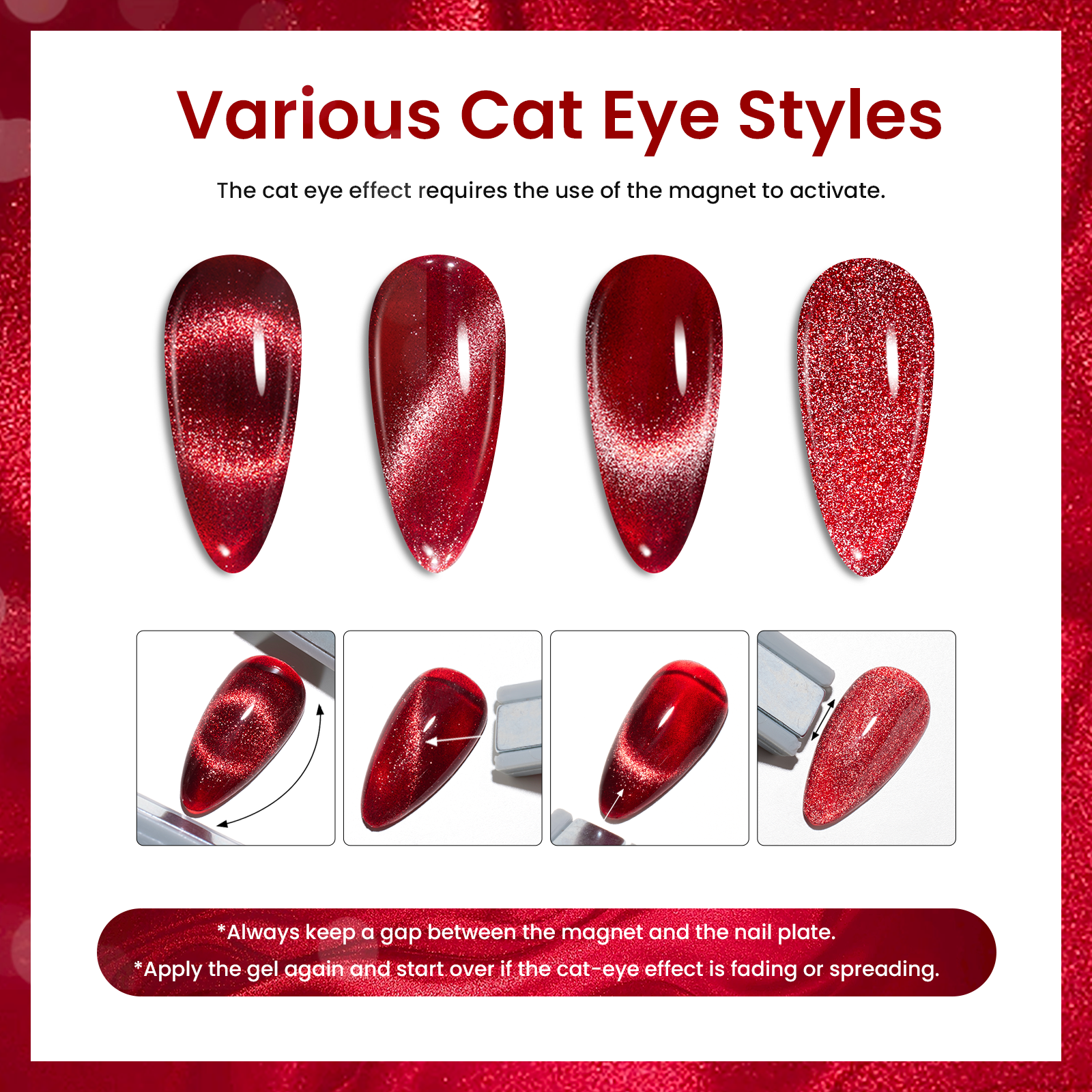 Before curing, use the magnet to achieve your desired effect, then cure under a lamp for 60 seconds. The closer the magnet is to your nails, the more spectacular the result. No need to touch the polish—simply hover the magnet close for a few seconds to unveil stunning cat eye effects. Color Numbers: D473, D474, D475, D476, D477, D478.