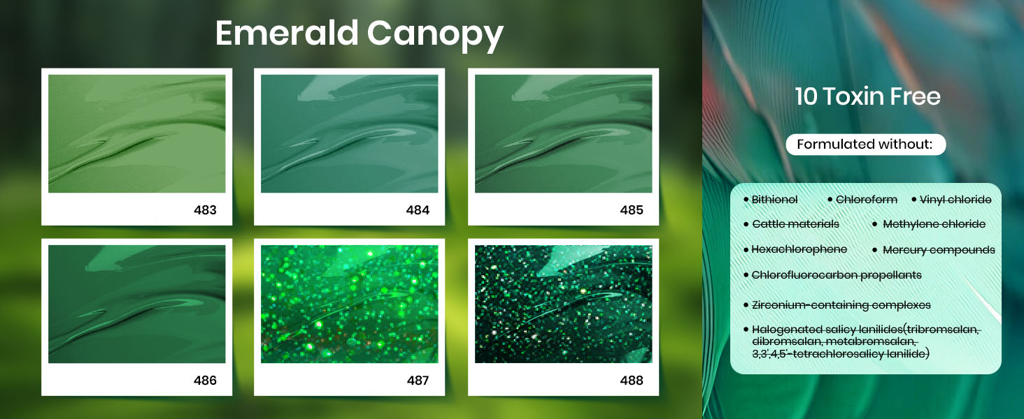 Embrace the richness of avocado green along with glitter green, dark green, and forest green. Create stunning, nature-inspired manicures at home with these versatile hues. Color numbers: 483, 484, 485, 486, 487, 488.