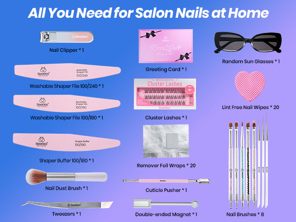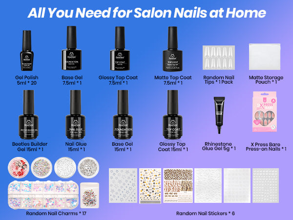 Abundant and Diverse Nail Art Kit: This Beetles Value Gift Box contains: 20 colors of nail art gel, designed for the summer and fall season, covering solid color gel*14, cat eye gel polish*3, glitter gel polish*3, This set is also equipped with base gel, builder nail gel, nail glue, Rhinestone Glue Gel, press ons, nail stickers, nail art diamonds and nail tools. Whether you want to create a simple solid-color manicure or a gorgeous decorated one, it can be easily achieved.