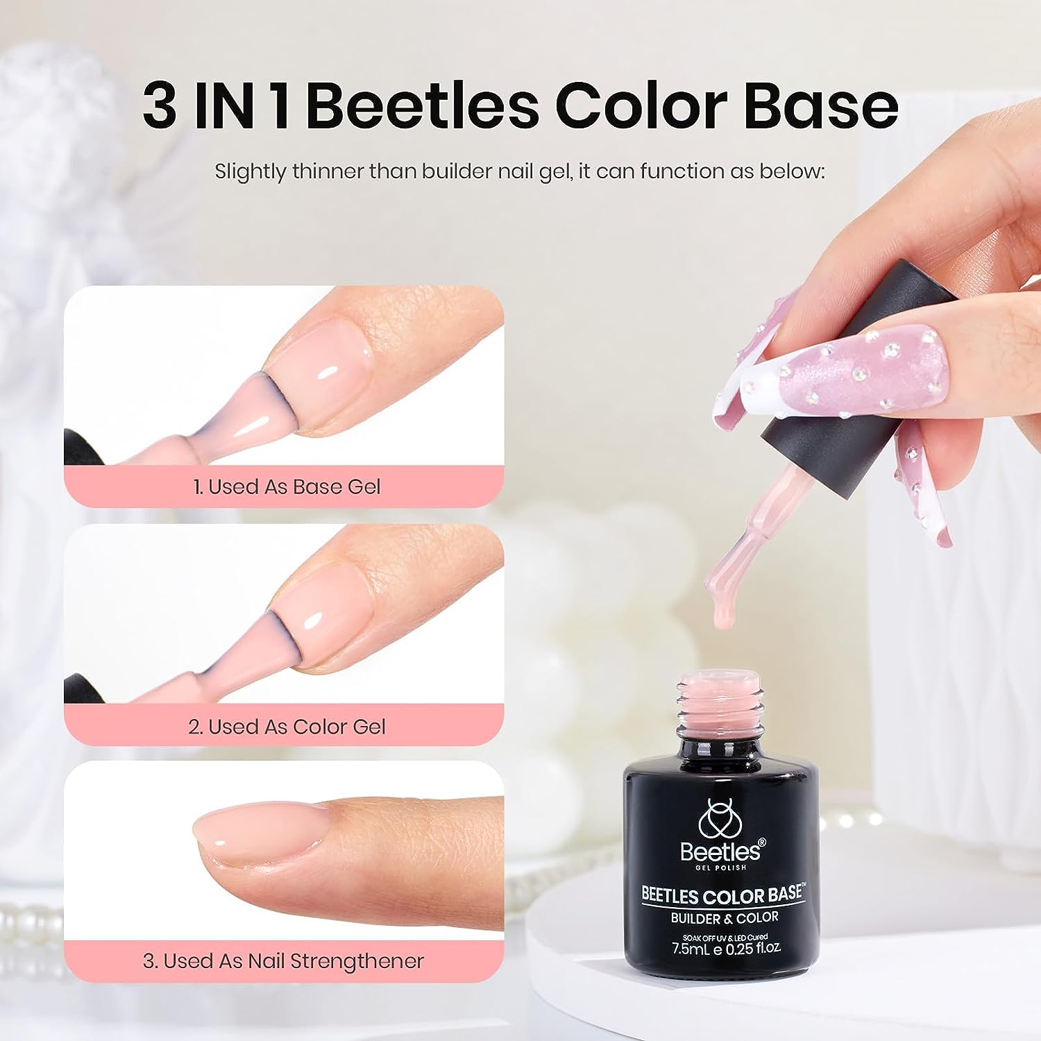 • 【Fancy 3 In 1 Rubber Base Gel】: 6 color 15ml/0.5Oz Nude Jelly shade collection set fit for all skin tones. Beetles builder base gel has superior self-leveling, low consistency and good self-leveling properties making it suitable for all people, which includes people for DIY nail art and professional nail salons